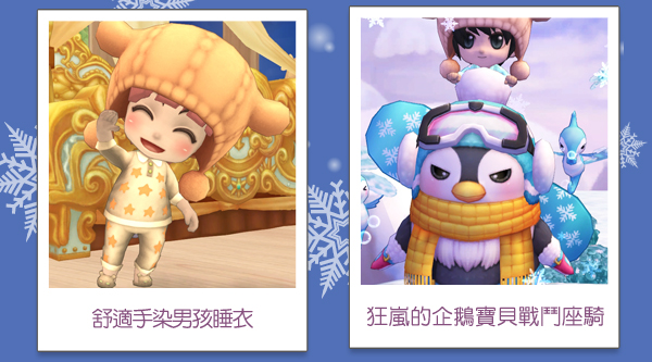 身為滑板高手的企鵝寶貝,有著齊全又酷炫的滑雪配備,讓牠帶著你一起在雪地中盡情奔馳吧! |